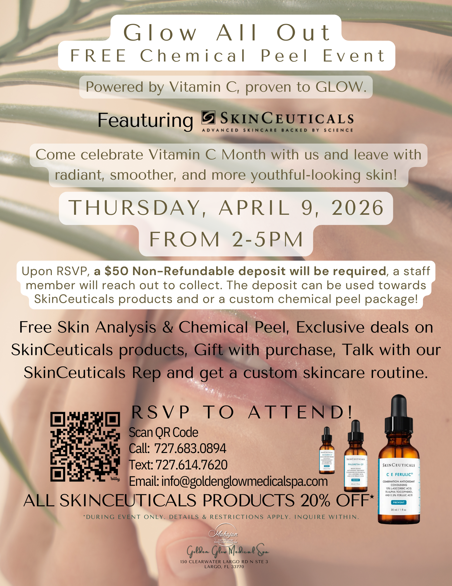 Upon RSVP, a $50 Non-Refundable deposit will be required, a staff member will reach out to collect. The deposit can be used towards SkinCeuticals products and or a custom chemical peel package!